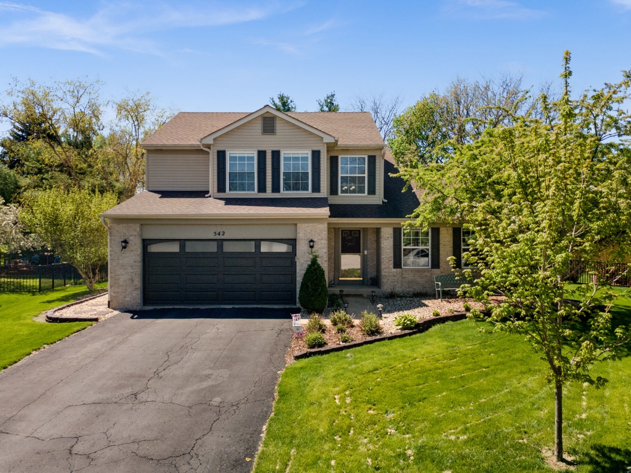 Nestled on a beautifully landscaped wooded lot backing to a nature preserve with direct access to the Great Western Trail, this stunning 4 bedroom, 2.5 bath brick two story in the desirable Hunters Hill neighborhood of St. Charles offers the perfect blend of privacy, space and updates. A charming front porch, paver walkway and 3 car sideload garage create standout curb appeal, while the backyard composite deck provides a peaceful outdoor retreat. Inside, you'll find a spacious living room, formal dining room with bay window and hardwood flooring, and an updated eat-in kitchen featuring hardwood floors, Kenmore Elite stainless steel appliances, granite countertops, subway tile backsplash, breakfast bar, pantry and bright dinette. The inviting family room showcases a beamed ceiling, floor-to-ceiling masonry fireplace flanked by built-ins and a wet bar, while the first floor home office offers a second fireplace and custom built-ins for a perfect work-from-home setup. Upstairs includes four generously sized bedrooms all with walk-in closets, highlighted by the primary suite with a private sitting area, third fireplace, walk-in closet and updated bath with double bowl vanity and walk-in shower. The full partially finished basement expands your living space with a game room with dry bar, exercise room and additional family room. Recent updates include new second floor carpet and fresh interior paint throughout most of the home in 2025, backup sump pump in 2023, and roof, garage doors and exterior siding stain in 2020, all within walking distance to nearby sports fields and just minutes from everything St. Charles has to offer.